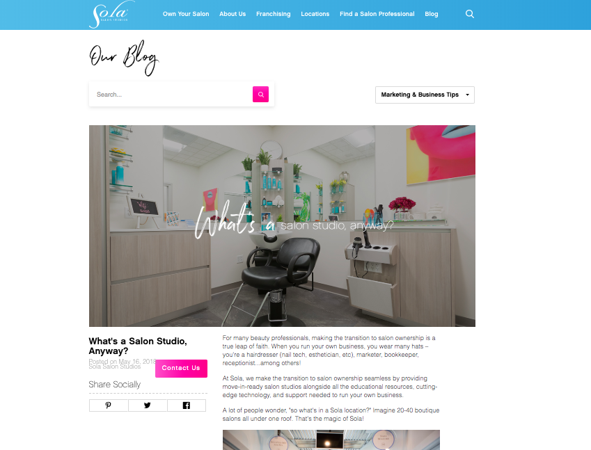 After examining the company’s Google Analytics, I determined that hundreds of website visitors reached solasalonstudios.com via the search term “What is a Salon Studio”. I created a blog post with that title to help bring in top of funnel website traffic and help boost awareness of the Sola Salon Studio concept.