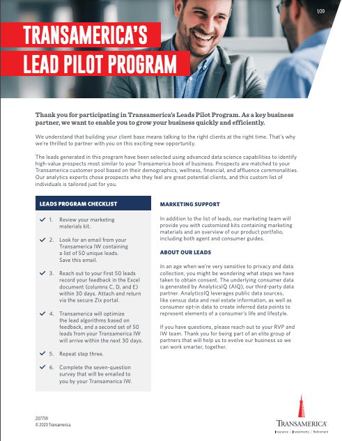 This is a sales-enablement resource for TransAmerica was created to help agents understand and opt into a newly established process for lead generation. I worked alongside the sales team to help articulate and streamline their messaging into a sharable document to help increase participation in the Leads Pilot Program.